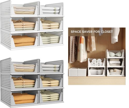 Pinkpum 6 Pack Closet Organizers Storage Bins 🧺 Stackable plastic drawer baskets perfect for organizing clothes, shelves, wardrobes, bathrooms, or offices—clean white design for a tidy home 🏡📦.