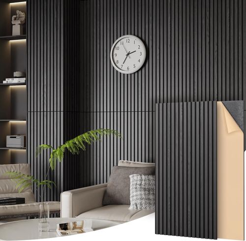 Qmetalart Acoustic Wall Panels enhance your space with sleek soundproofing 🎵. Matte black slats, self-adhesive, and perfect for living room or bedroom wall décor 🖤🏠.