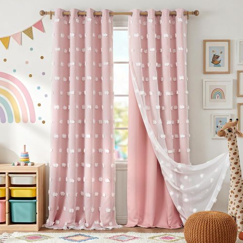 RYB HOME Pink Pom Pom Curtains brighten any girl’s room 🌸 Double-layer sheer tulle, thermal insulated, includes 2 bow tie-backs, 2 panels W52×L84 💖🪟