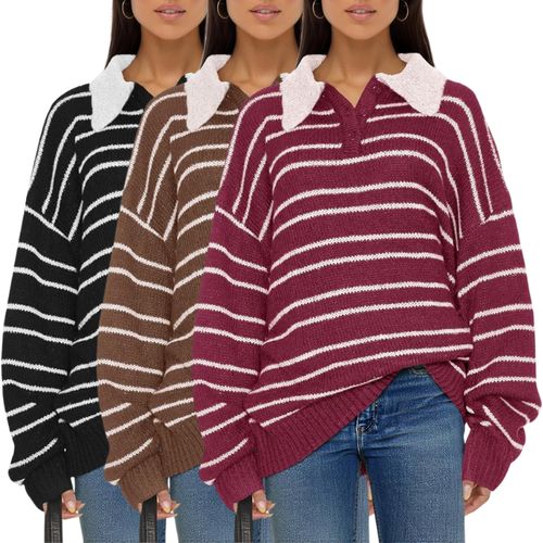 Saodimallsu Striped Sweaters bring cozy, trendy style. Button collar, oversized fit, chunky knit perfect for fall layering. 🍂🧶