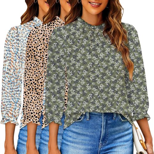 SimpleFun Blouse 🌸 blends professional style with feminine flair, 3/4 sleeves, ruffle neck, and flowy printed design—perfect for business casual, work, or dressy occasions 💕👚.