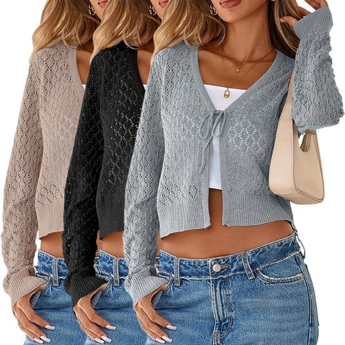 SimpleFun Crochet Cardigan elevates casual outfits. 👚Tie-front long-sleeve cropped knit design perfect layering lightweight versatile stylish cozy everyday wear. 🌸🧶
