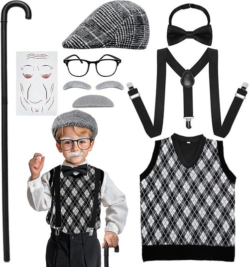 Skirfy Old Man Costume for Kids makes school celebrations fun. 🎉👴 Includes grandpa outfit accessories perfect for 100 Days school events. 🎒
