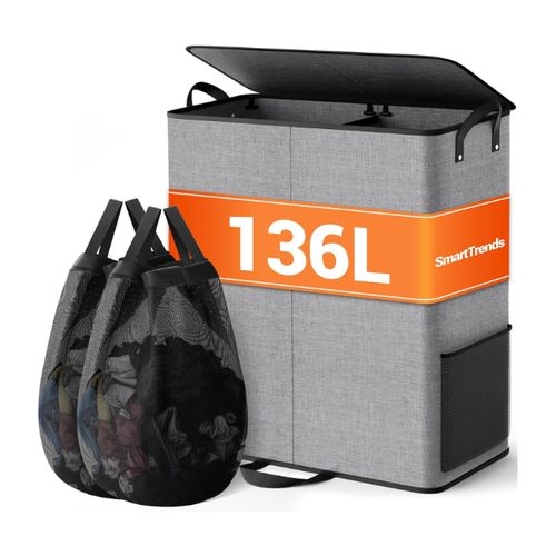SmartTrends Double Laundry Hamper 🧺💫 keeps sorting simple and stylish! 2 sections, removable bags, and sturdy 136L capacity 🩶.