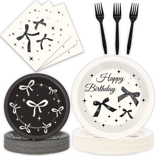 SUGORER 100 Pcs Black Bow Party Decorations! 🎀 Level up your birthday setup! All-in-one black bow plates, napkins & utensils! 🎉
