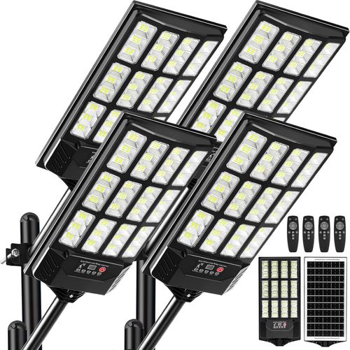 SZPIOSTAR 4-Pack Solar Street Lights ☀️💡 brighten outdoor spaces efficiently. 6500K, motion sensors, dusk-to-dawn, IP66 waterproof, dimmable, remote-controlled security lighting