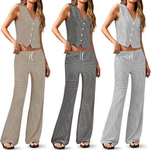 Tankaneo 2-Piece Striped Set offers comfy, stylish lounging 🌿Sleeveless button vest, drawstring pants, perfect for home or casual wear 🖤.