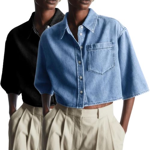 Tankaneo Womens Crop Denim Shirt adds chic casual style. 👖 Half sleeves, button-down design, handy pocket for effortless everyday wear.