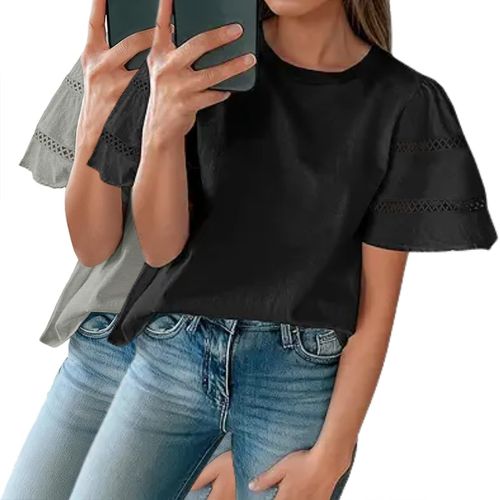 Tankaneo Eyelet Short Sleeve Tops are breathable, stylish summer essentials. Loose fit, eyelet fabric, crewneck design for all-day comfort.☀️👕