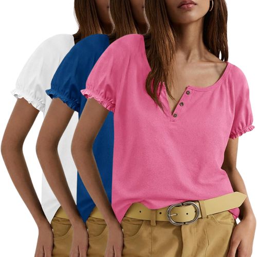 Tankaneo Short Sleeve Henley Shirt. Ruffle crew neck, cute loose fit, casual summer basic tee for everyday comfort πΈπ