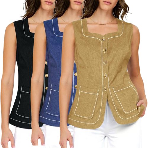 Tankaneo Square Neck Denim Vest! 💙 This sleeveless jean waistcoat is button-down, a stylish square neck, and includes front pockets for a casual summer top. ☀️👚