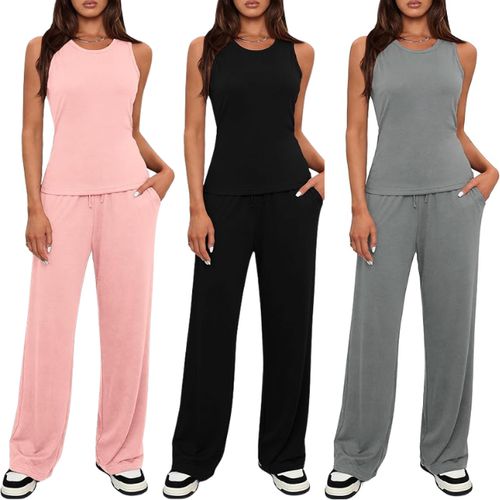 Totatuit Women’s 2-Piece Summer Lounge Set ☀️ Sleeveless round-neck top with matching wide-leg pants, lightweight and relaxed—perfect for vacations, airport travel, or casual summer outfits 💖👗.