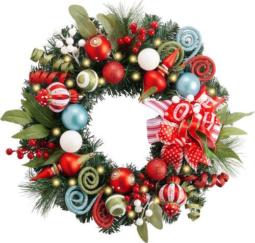 Valery Madelyn 18" Pre-Lit Christmas Wreath brightens any holiday space. 🎄 Multi-colored ornaments, festive bow, and built-in warm lights.