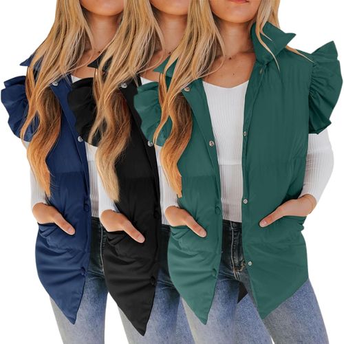 Valphsio Puffer Vest brings stylish warmth for winter days ❄️🧥. Ruffle sleeves, button-down design, and handy pockets for cozy outfits.