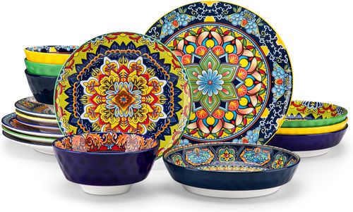 vancasso 16 Pieces Plates and Bowls Set! 🍽️ Bohemian porcelain design, service for 4, microwave & dishwasher safe, perfect housewarming gift! 🎁💙