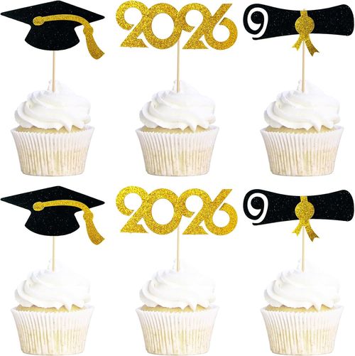 VINCREY Graduation Cupcake Toppers 48 PCS add stylish flair to your celebration 🎓 Pre-assembled, black-gold, Class of 2026 🎉