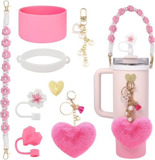 VIQWYIC Water Bottle Accessories Set 💧 upgrades your Stanley 30oz & 40oz tumblers. 🥤 Includes handle strap, silicone boot, straw cover, and pearl charms! 🎀