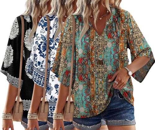 WIHOLL Boho Summer Top 🌸 This blouse a flattering V-neck and stylish 3/4 sleeves, making it the perfect transition piece from the office to a beach vacation! 💼