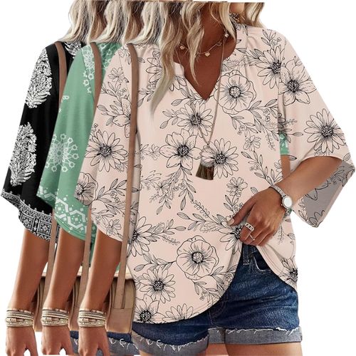 WIHOLL Boho Summer Tops for Women blend dressy casual style. V neck, 3/4 sleeves, plus-size friendly for business beach holidays 🌸🏖️💼