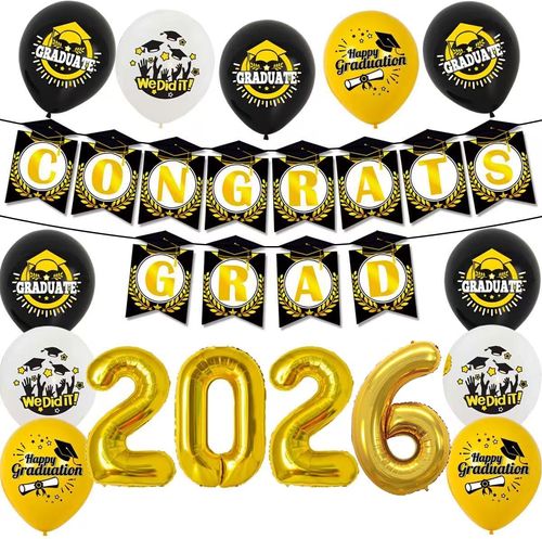 Wikadada Graduation Decorations 2026 Party Kit includes a "CONGRATS GRAD" banner and balloons. 🎓🎉 12 premium balloons plus 16" gold "2026" foil balloon, perfect for college or high school parties. 🎈
