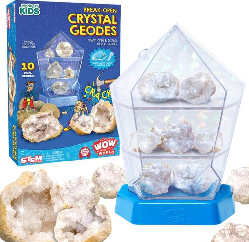 WONDERY KIDS Wow in The World inspires young scientists. 🔬 10 real break-open crystal geodes with display case, goggles, magnifying glass, and companion audio STEM content for ages 6+. 💎🧒👧