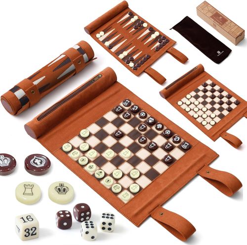 Woodronic 3-in-1 Travel Backgammon Set! 🎲 Includes chess and checkers, roll-up leather board, premium pearl pieces for family travel fun! 🎁♟️