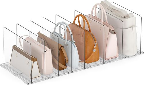Yecaye Purse Organizer 👜 keeps handbags neat and visible. Adjustable clear plastic rack, versatile shelf divider for closets, bedrooms, office, and kitchen.