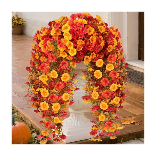 YIBUKIY Artificial Fall Hanging Flowers 🍂🌸 – 2-pack faux silk morning glory mums for outdoor décor. UV-resistant, realistic, perfect for garden, porch, or balcony. 🏡🍁