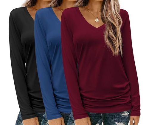 Zeagoo 3 Pack T-Shirts 👚upgrade your fall wardrobe! V-neck long sleeves, soft solid fabric, and casual basic tees perfect for everyday outfits S–XXL 🍂💖.