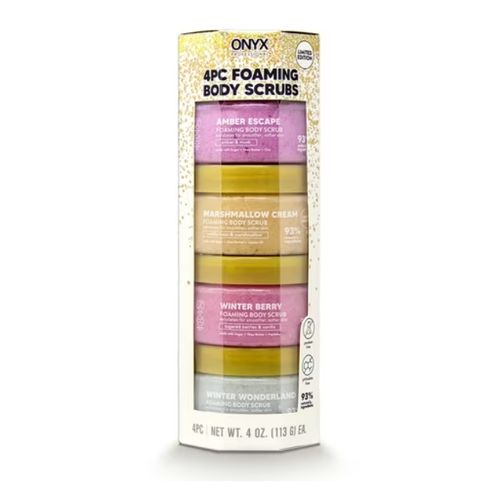 ONYX Professional Mini Foaming Sugar Scrub Gift Set. Four pieces, 4oz each, gentle exfoliation for smooth glowing skin at home 🛁